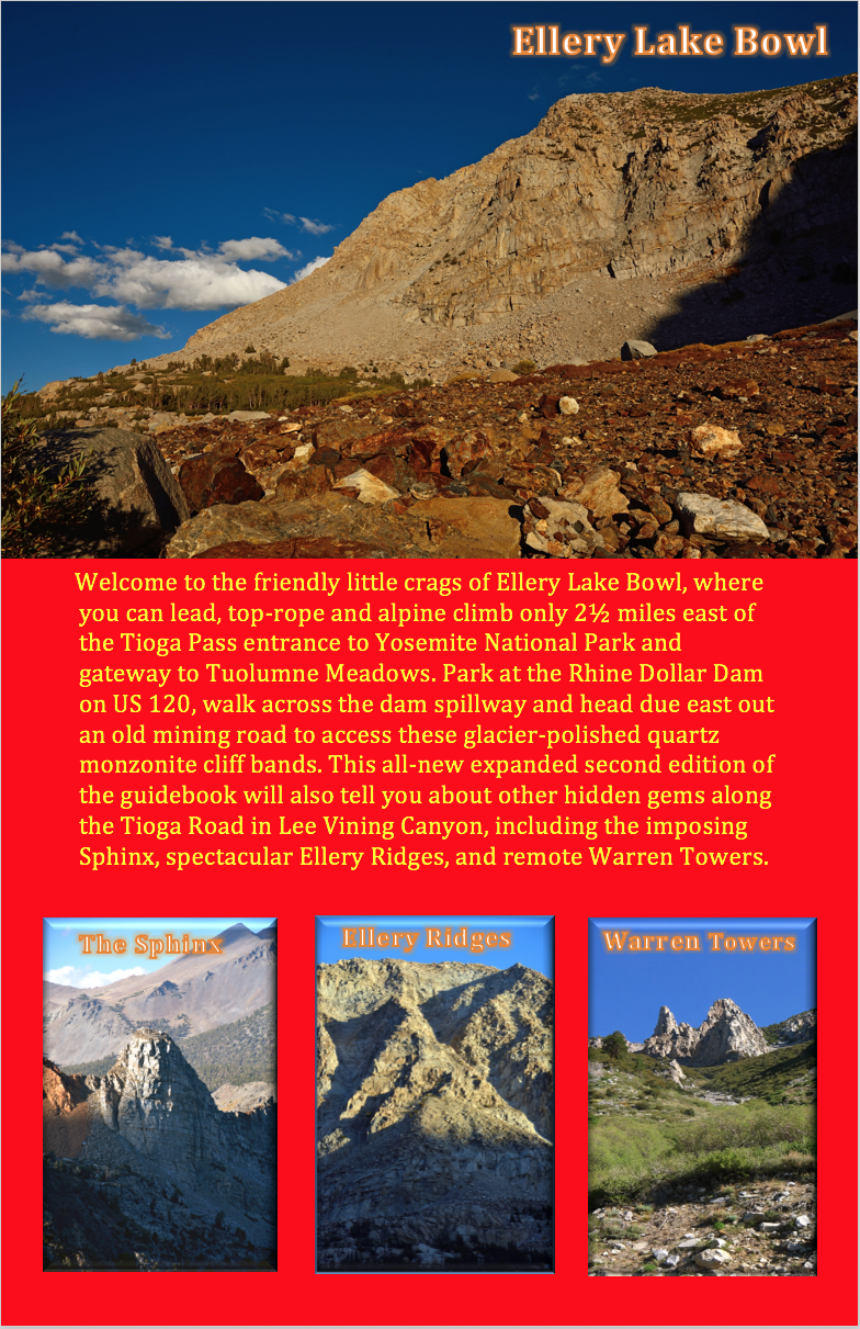 The first edition of the Ellery Bowl Guide introduced a host of previously undocumented short climbs scattered above and below the old Mining Road that runs due east out the granite-covered hillside from the Rhine Dollar Dam on Ellery Lake. This new completely revised and expanded second edition takes up where its predecessor left off and documents many more unfamiliar routes as part of a long-term effort to publish a comprehensive guide to the whole of Lee Vining Canyon. An added section describes the steep crack climbs found on Golden Rock in Ellery Bowl, home of the local classic “Speed of Life” (II 5.11b). For the first time, there are also directions about how to access the spectacular alpine Ellery Ridges shooting up the imposing south face of Lee Vining Canyon to the broad flat summit of Dana Plateau. In addition, several more sections are devoted to unfamiliar large rock formations along US 120 on the north side of Lee Vining Canyon, including The Sphinx, Pyramid and the north, middle and south Warren Towers.
